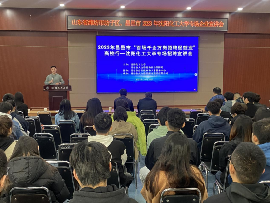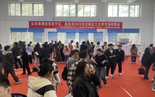 下午,山东省潍坊市坊子区、昌邑市2023年沈阳化工大学专场招聘会在学校体育馆体操馆举行。