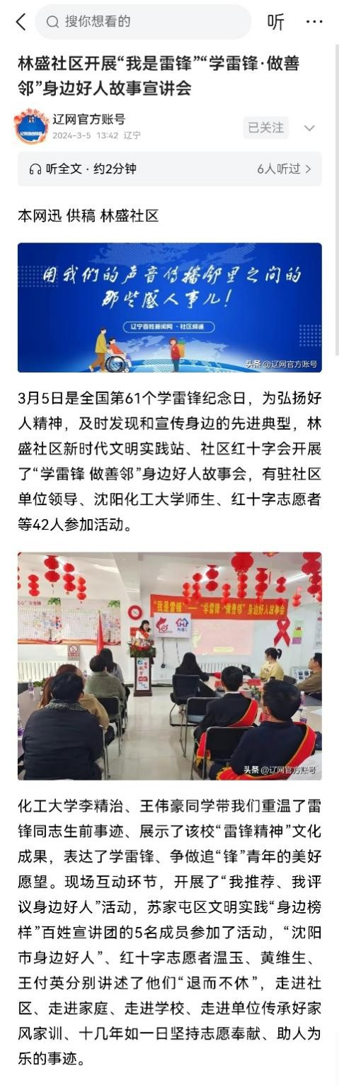 3月5日是全国第61个学雷锋纪念日,为弘扬好人精神,及时发现和宣传身边的先进典型,人文与艺术学院团委书记带领社会工作专业近20名本科和研究生同学赴苏家屯区林盛社区新时代文明实践站、社区红十字会开展了“学雷锋 做善邻”身边好人故事会,有驻社区单位领导、红十字志愿者等42人参加活动。本次活动获得了云盛京客户端、今日头条辽网官方账号等多家媒体的报道和转载。