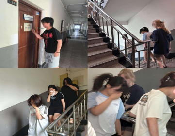 随着模拟火灾警报响起,演练正式开始。在宿舍内,同学们迅速响应,听到 “敲门声”后,立即捂住口鼻、弯腰低姿,按照预定疏散路线,有序撤离至安全区域。整个疏散过程紧张有序,展现出学院日常安全教育的扎实成效。