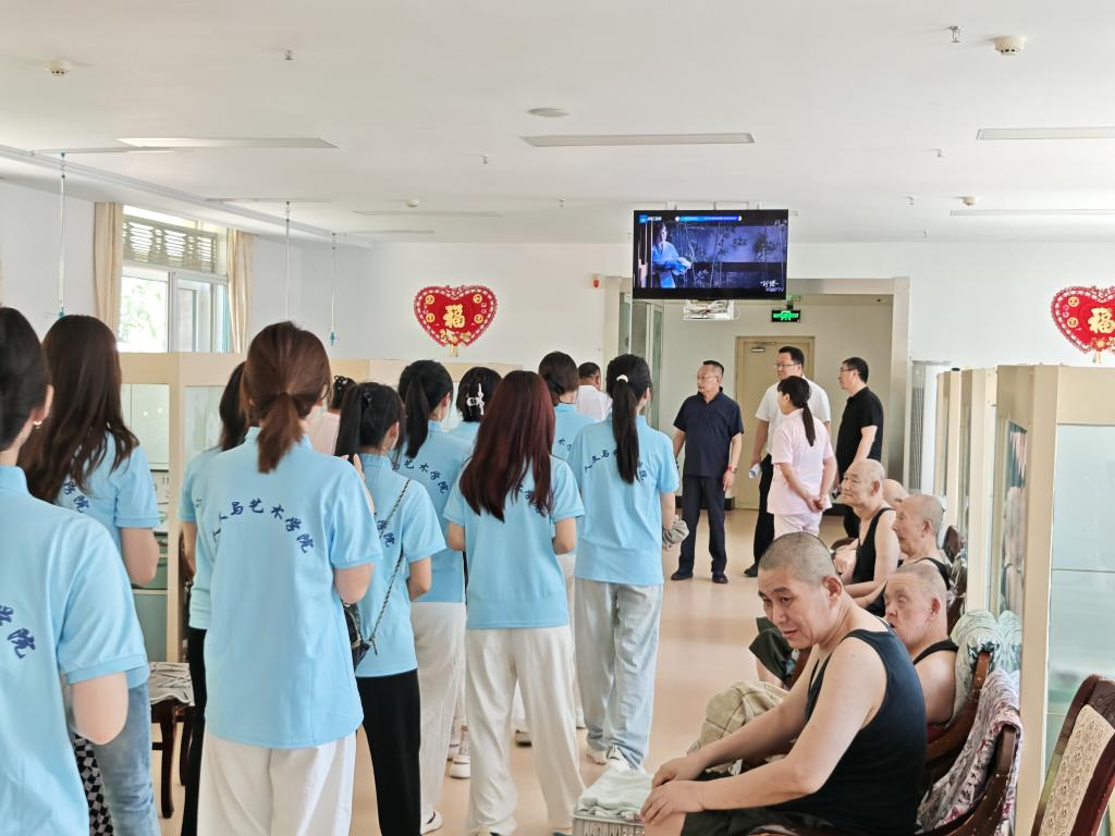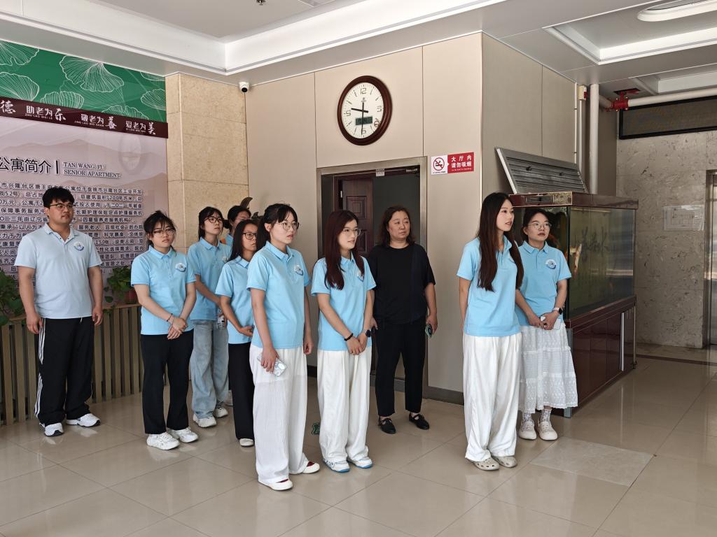 在盘锦市唐王府老年公寓,团队参观调研老年公寓的运营管理模式和服务特色。工作人员向团队介绍了老年公寓的基本情况,带领我们感受公寓环境并与老年人进行了互动交流。老年公寓分为两部分,一部分为需要护理照顾的失能、半失能老人的生活区域,另一部分则是自理老人生活区域。老年公寓里配备娱乐区、活动区等,为老年人提供优质的生活空间,提高其养老生活质量。实践团成员也亲身感受到了机构养老的现实情况,以及在机构养老中专业护理和社会介入的重要性。
