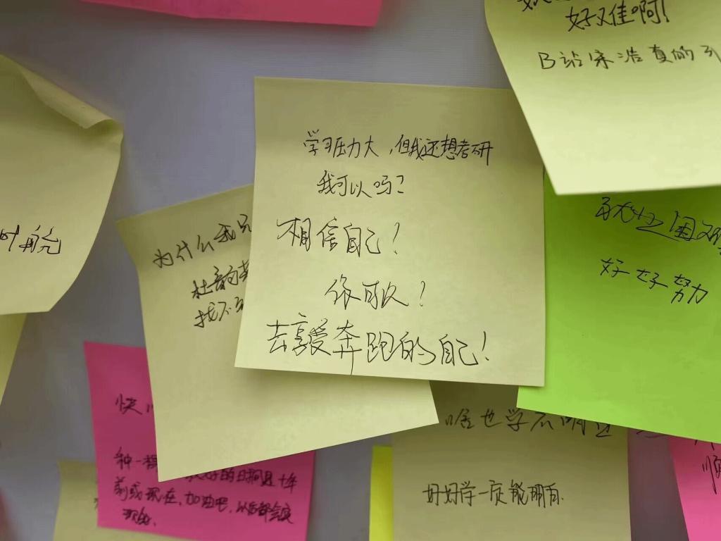 活动一出便吸引了众多同学参与,场面非常火爆,心理展板不久便贴满了100多张情绪便签。在活动现场,许多同学在便签上写下自己的焦虑或者烦恼,如:“学习压力大,但我还想考研,我可以吗?”“我觉得自己比较自卑”,“自己努力学习但是没有得到相应的结果”,随后将带着烦恼的便签贴在心理展板上,从安慰盲盒中随机抽取一张“安慰纸条”,再写下一张新的“安慰纸条”投递到安慰盲盒中,并回答展板上的烦恼。参加活动的同学说:“这个活动很有趣也很有意义,倾诉了自己烦恼的同时还得到了安慰,在很平常的日子里被陌生人鼓励了一下,这种感觉很奇妙。”组织这次活动的同学发出感慨:“人人都有焦虑,面对焦虑,我们要学会及时发现、及时抒发、及时调整。一个善意的称赞,能够给人以温暖的阳光缓解焦虑;一个真诚的鼓励,能够像春风一样吹暖人心吹走焦虑;一个随口的安慰,能够给人带来希望面对焦虑。”
